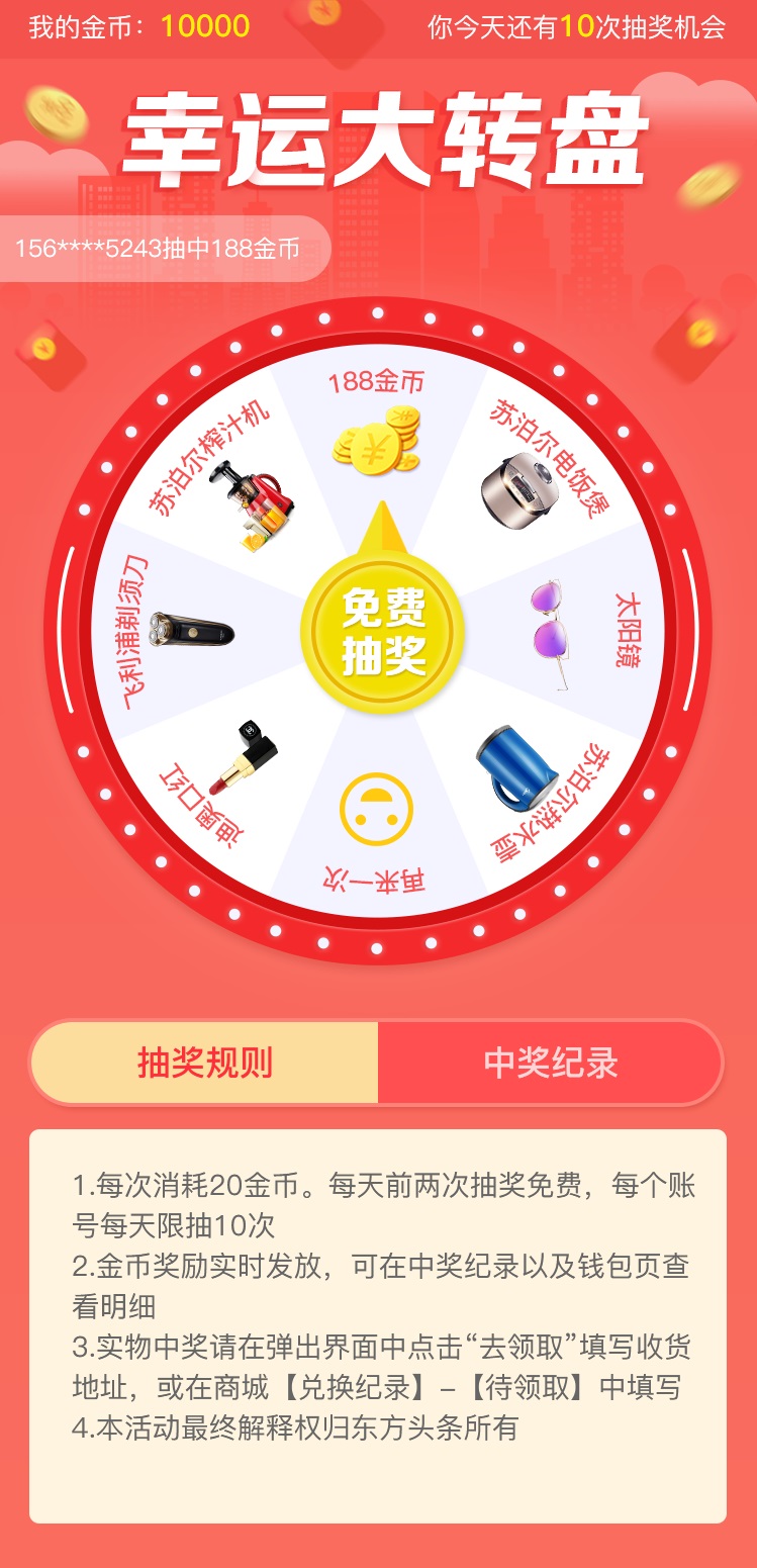 用戶在東方頭條平臺,通過閱讀、評論、分享內(nèi)容或邀請好友獲取的金幣,均可參與“幸運大轉(zhuǎn)盤”抽獎活動,每消耗20枚金幣可兌換一次抽獎機會,月餅禮盒、陽澄湖大閘蟹及干紅葡萄酒等好禮繽紛上場。