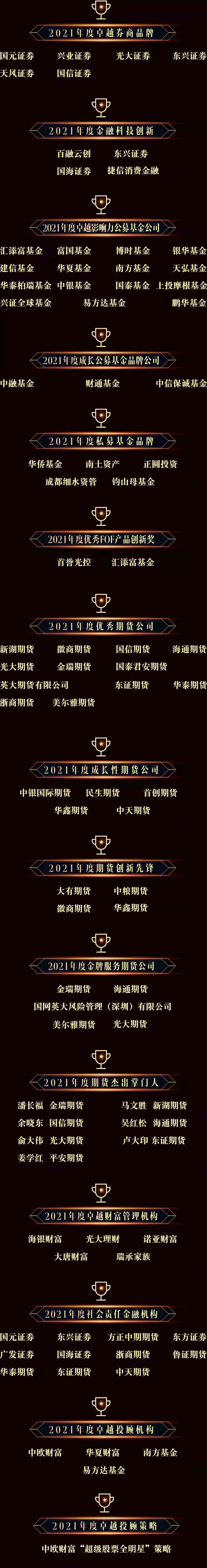 “第十九屆中國財(cái)經(jīng)風(fēng)云榜2021年金融機(jī)構(gòu)評(píng)選獎(jiǎng)項(xiàng)”共設(shè)置包括“年度卓越券商品牌”、“年度金融科技創(chuàng)新”、“年度卓越影響力公募基金公司”、“年度成長公募基金品牌公司”、“年度私募基金品牌”、“年度優(yōu)秀FOF產(chǎn)品創(chuàng)新獎(jiǎng)”、“年度優(yōu)秀期貨公司”、“年度成長性期貨公司”、“年度期貨創(chuàng)新先鋒”、“年度金牌服務(wù)期貨公司”、“年度期貨杰出掌門人”、“年度卓越財(cái)富管理機(jī)構(gòu)”、“年度社會(huì)責(zé)任金融機(jī)構(gòu)”、“年度社會(huì)責(zé)任金融機(jī)構(gòu)”、“年度卓越投顧機(jī)構(gòu)”、“年度卓越投顧策略”等獎(jiǎng)項(xiàng)。