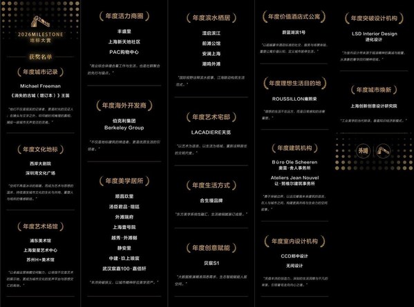 下午,2026 MILESTONE地標(biāo)大賞盛大啟幕?,F(xiàn)場揭曉了十六個重磅獎項,見證了當(dāng)代地標(biāo)如何融合商業(yè)生活、藝術(shù)宅邸與人文肌理,用突破性的設(shè)計語言重新定義美學(xué)資產(chǎn)。活動還設(shè)置了多場圓桌論壇與專題分享,邀請到澳門大學(xué)歷史系講席教授王笛、復(fù)星基金會及復(fù)星藝術(shù)中心主席王津元、壟上藝術(shù)機構(gòu)創(chuàng)始人江寧、藝術(shù)家吳觀真、蘇州H+美術(shù)館執(zhí)行館長呂金洲、新加坡吉寶城市發(fā)展部中國執(zhí)行副總裁張逸、瑞安新天地社區(qū)創(chuàng)新總經(jīng)理袁瑗、鐵獅門設(shè)計與工程董事總經(jīng)理陰杰、「上下」首席執(zhí)行官劉微粒、Berkeley Group伯克利集團(tuán)中國區(qū)負(fù)責(zé)人陶曉峰、上海CCD高級副總裁&全球合伙人陳彥豪、創(chuàng)邑廣告創(chuàng)始人Amanda、讓?努維爾事務(wù)所合伙人陳晨、HBA資深設(shè)計總監(jiān)劉運發(fā)、奧雷舍人事務(wù)所合伙人張啟民、SHL設(shè)計總監(jiān) Chris Hardie,就相關(guān)議題展開對話,為觀眾帶來跨領(lǐng)域的思想啟迪。